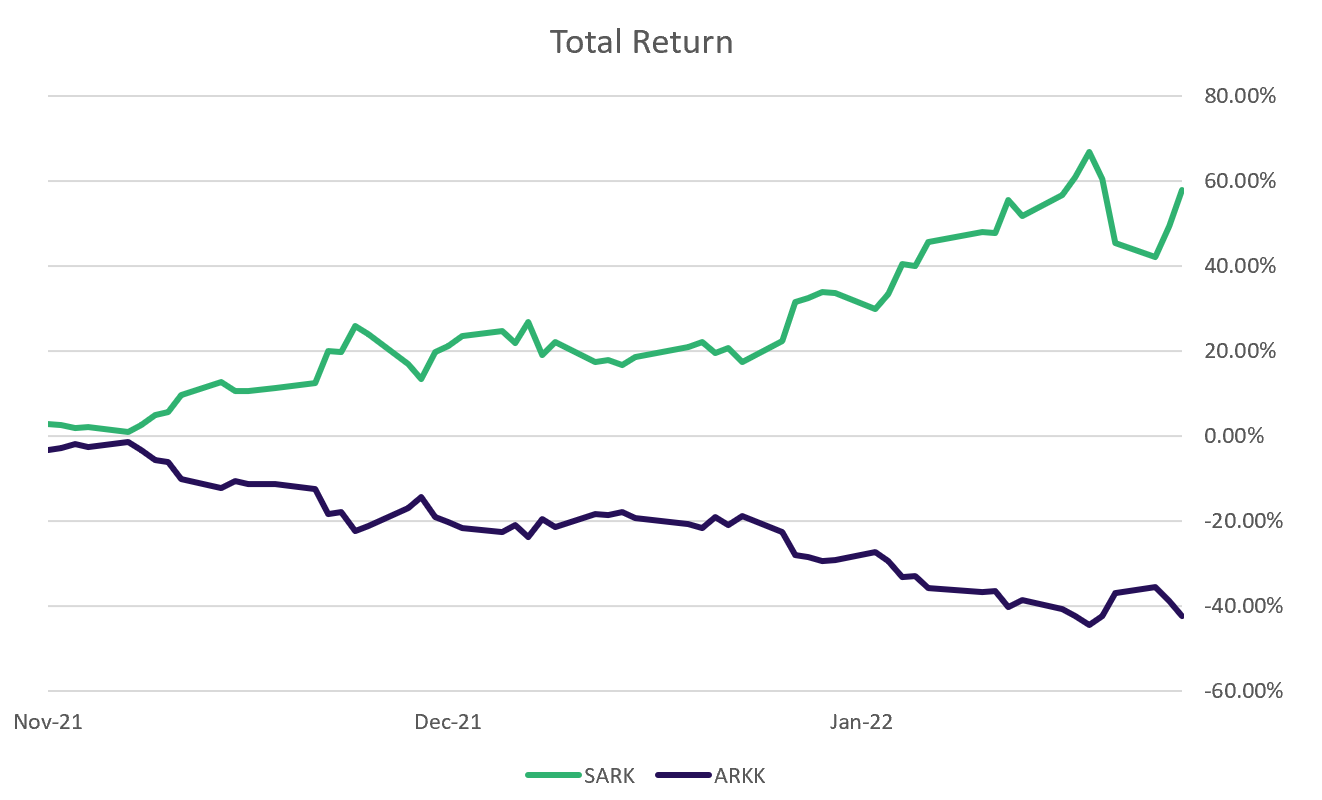 Shorting the holdings within ARKK has proven to be quite profitable, as SARK has generated close to a 58% return in less than three months. Naturally, ARKK is in the red in that same timeframe — but we see the impact of volatility, as ARKK is “only” down 42.3%.