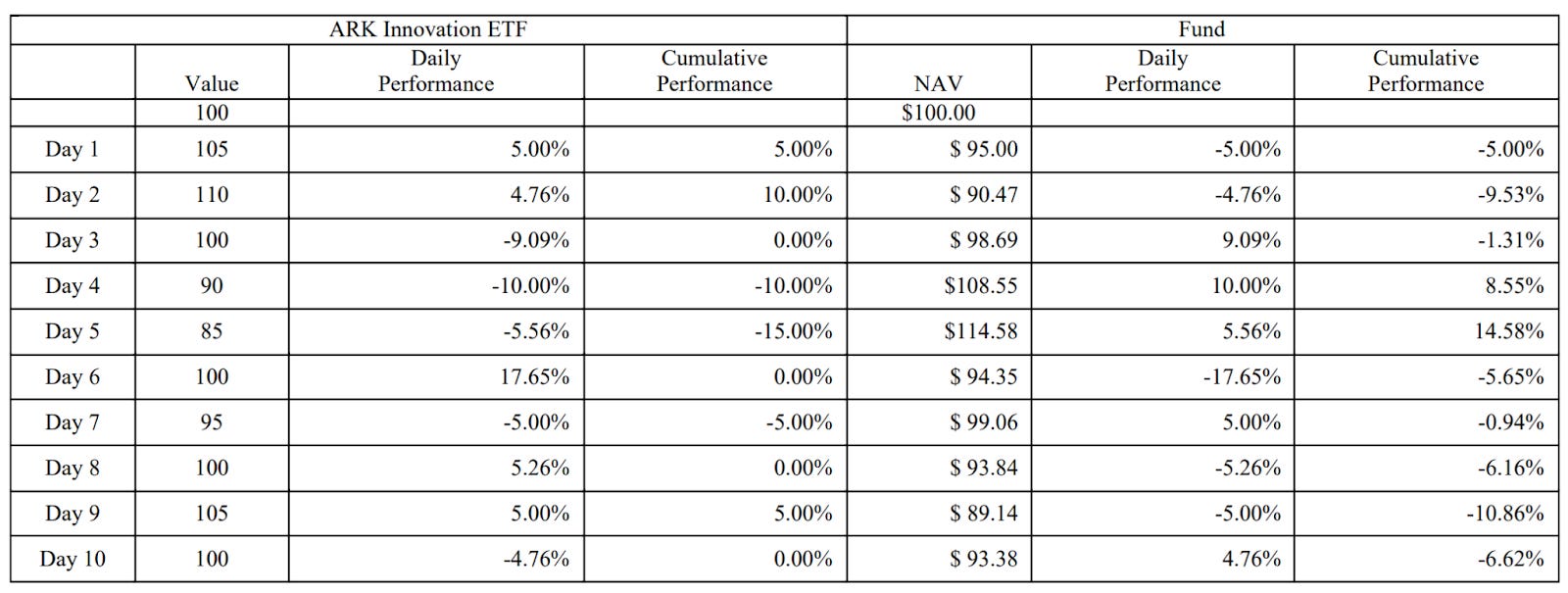 Here’s another example from the prospectus, except this time we see performance stretched out over a 10-day trading period. Although ARKK generates a cumulative 10-day return of 0%, its volatility causes the Fund to generate a -6.62% return.